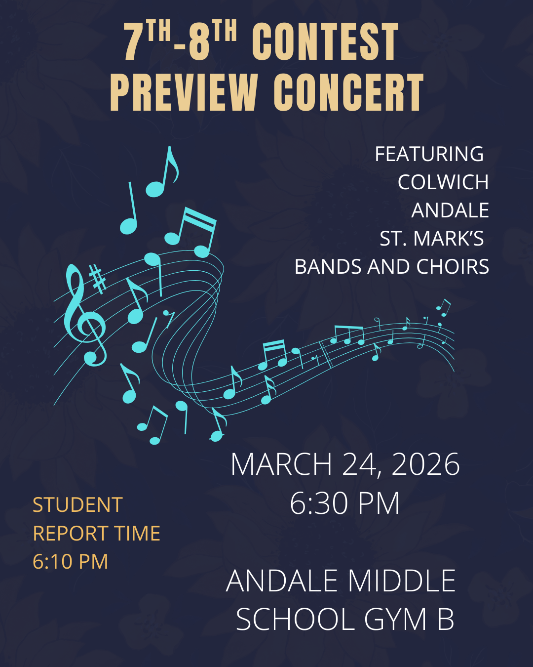 - Tuesday, March 24 is middle school's preview concert at Andale Middle School at 6:30. Our band and choir will feature songs they have prepared for contest.